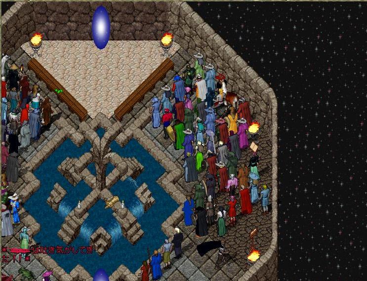 今日はアイテムの配布イベントがあると言うことで・・・ 普段じゃありえない人数がNew Havenに!(この後もっと増えた) 恐らく今日のイベントの為だけに生まれたであろう新人さんとお喋りをしていたら・・・・ 会場行きのゲートが出現! *みんなゲートへまっしぐらの図* ゲートを潜るとそこは・・・ 何だか見覚えのある場所・・・・・? *クリックで拡大* ・・・に似ているだけでした!(ちなみに呪文が使えなかったのでマークは出来ませんでした。 そうこうしていると上のゲートの辺りに今日の主役 Ryssaさん登場! 今回のイベントは会場へのペットの連れ込みを禁止していたので ・・・・ (*ゲキテツお前は何を言っているんだ*) ってな感じで注意を促した瞬間一匹の馬が野生化した。 誰かがビビって野生化させたみたいだった。 それでもペットを厩舎に預けに行かなかった人が・・・ (実際は人多すぎて行けなかったんだと思う) GM権限で移動させられておもいっきり見せしめに・・・ 次の瞬間・・・ 消えたっ!!!!・・・。(おー怖っ そんなこと言っている場合ではござらんよ!(おいらも守ってないけど) つづく!